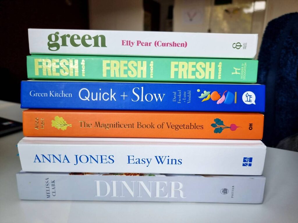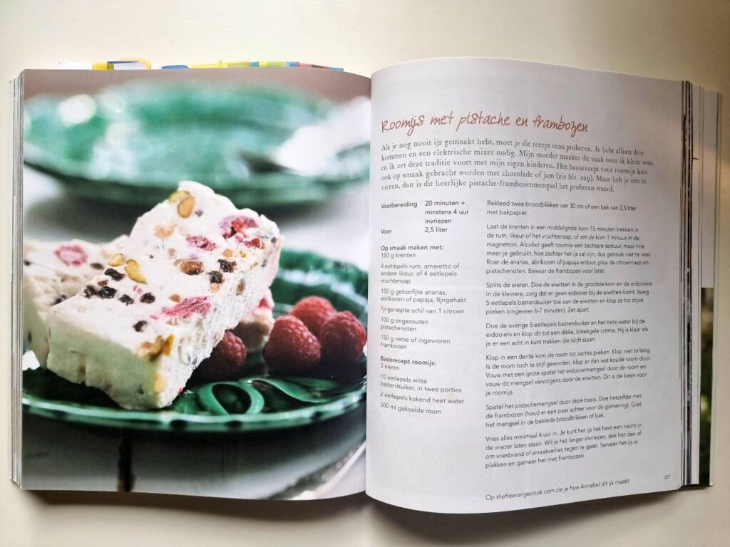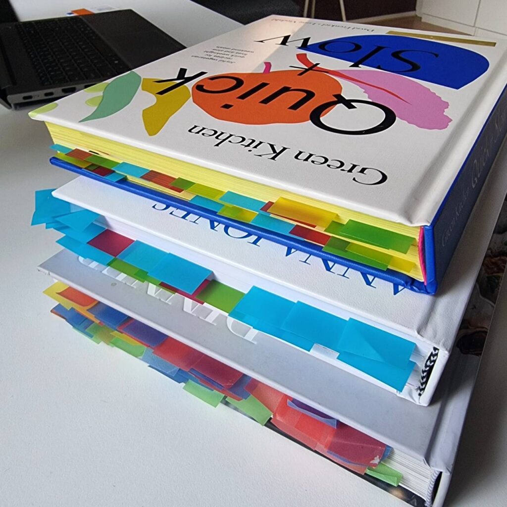 Another way to use your cookbooks more is to ‘mark ahead’. I try to sit down with a new cookbook and mark the recipes I want to try later. Which I also find very relaxing and fun to do! For example, start by marking 3 recipes: an appetizer, a main, and a dessert. Or mark only those recipes you’re sure your kids will eat. Or start by marking only the spring dishes if that season is coming up. This will give you a quick start, once the moment comes that you have the time and energy to cook something new.